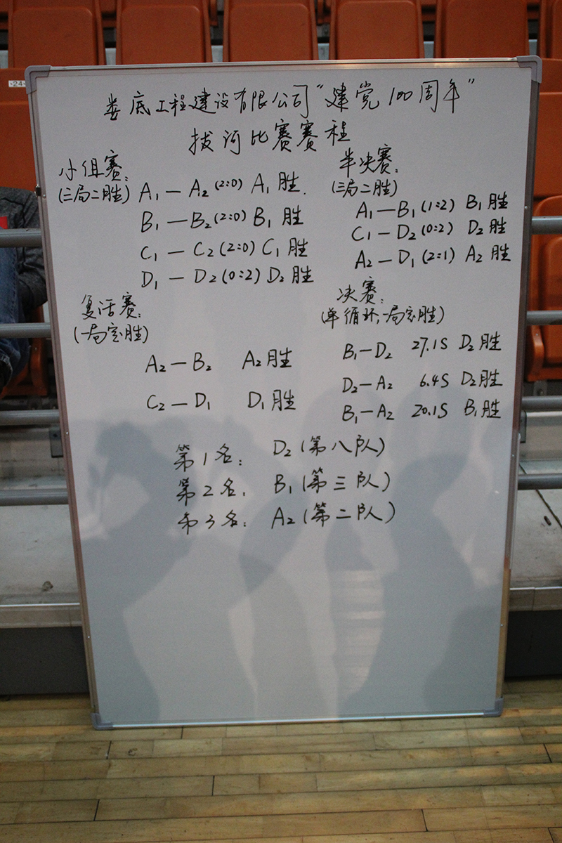 本次比賽根據隨機抽簽組隊,以“12人對12人拔河”,此次賽制分為淘汰賽、復活賽、半決賽、決賽四個階段。在比賽過程中,各隊人員都顯示出最強的比賽陣容,齊心協(xié)力,勇爭第一!為保證比賽的公平、公正、公開,賽會特設裁判1名,記錄員1名,維持秩序人員4名,另外還有現(xiàn)場攝影者1名。
